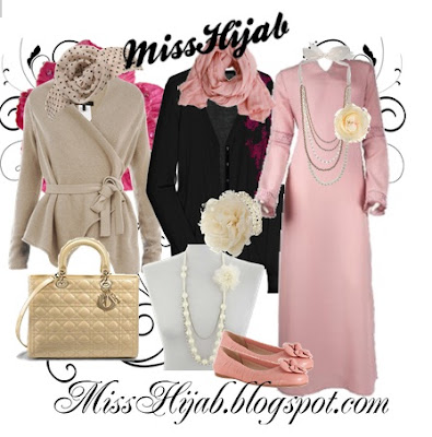 This style is made up of light, nude pinks, which look so girly yet elegant, a simple black maxi dress with a long wrap cardigan is the best for coverage. Add some coloured accessorize to finish off the touch.